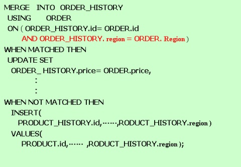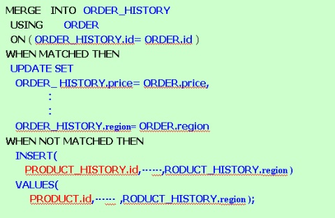 ORDER資料表是企業銷售部門的訂單資料,利用Merge語法可將ORDER的資料轉入資料倉儲中的ORDER_HISTORY資料表。已經存在的資 料,資料庫系統即以藍色「UPDATE」字句的字串修改該筆資料;尚未存在的資料,則以藍色「INSERT」所帶出來的字句新增該筆資料。