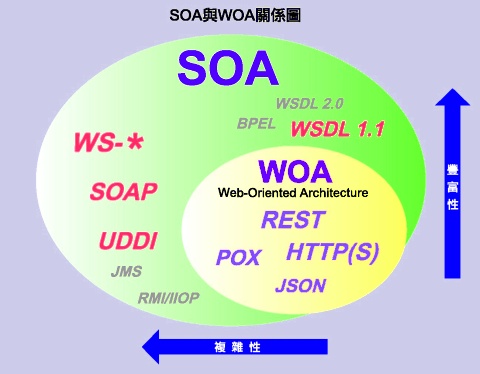 | 隨著Web 2.0襲捲而起的新浪潮,將軟體變成網站服務的風潮方興未艾。利用Web作為軟體運作平臺與服務,是Web 2.0時代一個鮮明的特色,因此也產生了WOA(Web Oriented Architecture,Web導向架構)這個新詞,用來描述這種現象。 WOA是SOA的子集合 2005年年底,IT研究機構Gartner發布了一個縮寫字WOA,定義它屬於SOA(Service Oriented Architecture,服務導向架構)的一個子集,並可以簡單的用「WOA = SOA + WWW + REST」這樣的算式來說明。 提出這個詞的Nick Gall認為,之所以必須新鑄詞彙,從SOA中切割出一塊新領域,在於SOA導入方法很多,而WOA代表一種完全倚賴Web的形式。 在Gartner的部落格上,副總裁Whit Andrew解釋使用WOA一詞,事實上也意味著企業在系統上的需求,不總是事事要做到十足的穩固、可靠與嚴密,有時快速、輕簡如WOA,即足以符合企業特定的需求。 WOA專指透過WWW(Word Wide Web)這個媒介和REST(Representational State Transfer,表徵狀態移轉)架構作為SOA的執行方式,REST簡單而言,是一種寬鬆、簡單協定,藉由HTTP管道傳送資料,而無須額外的訊息層, 像是SOA使用的SOAP協定。