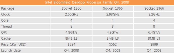 與 Extreme 型號同時登場, 2.93GHz 效能級型號與 2.66GHz 主流級型號 Bloomfield 每千顆單價分別為 USD $562 及 USD $284 ,定價僅較上代時脈相約產品略高。